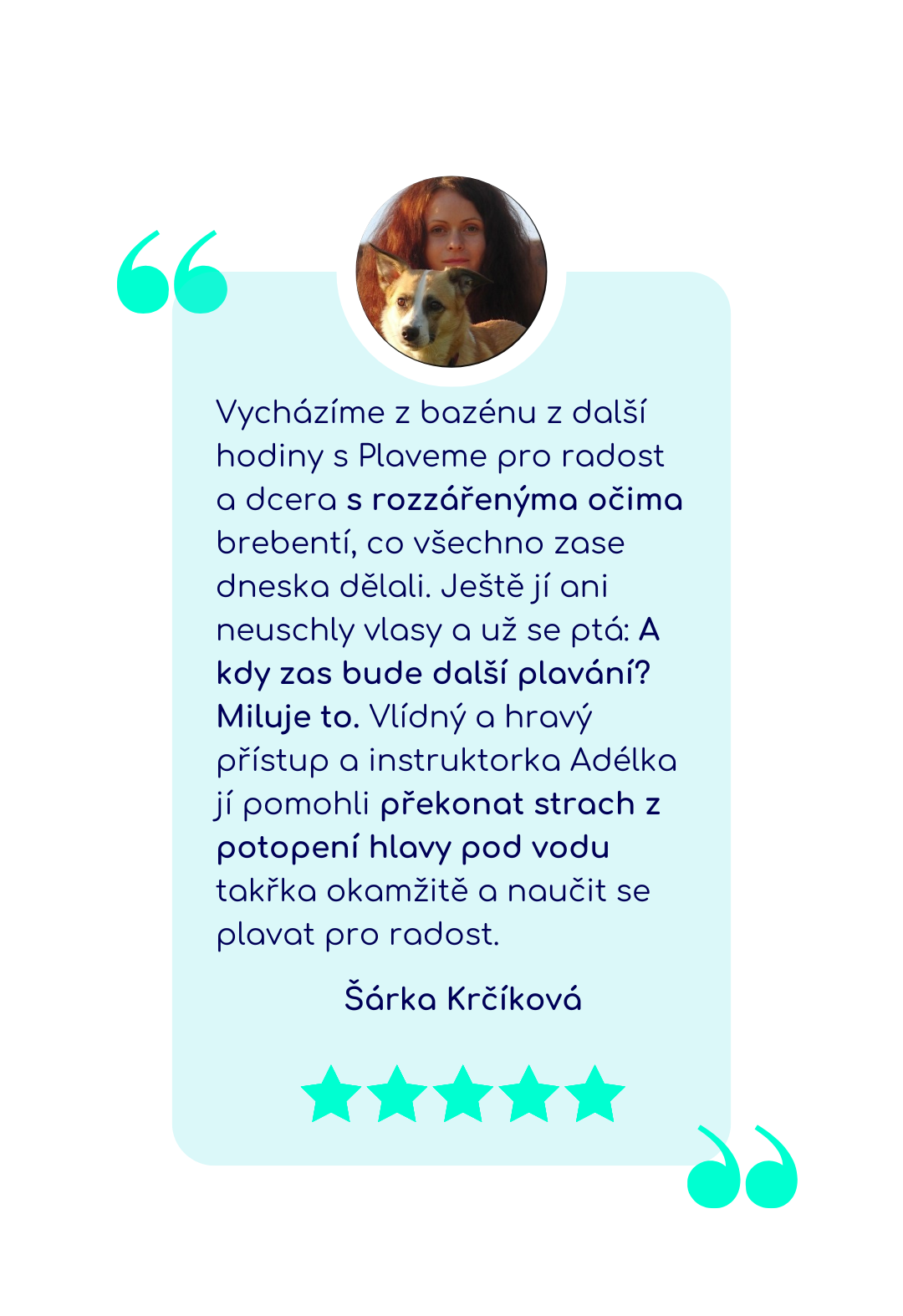 Děti potřebují odborníka i člověka, kterému mohou důvěřovat. U nás nejsou lektoři jen „na kraji bazénu“ – jsou ve vodě s dětmi, vnímají jejich pocity, podporují je v jejich tempu a slaví každý malý pokrok.